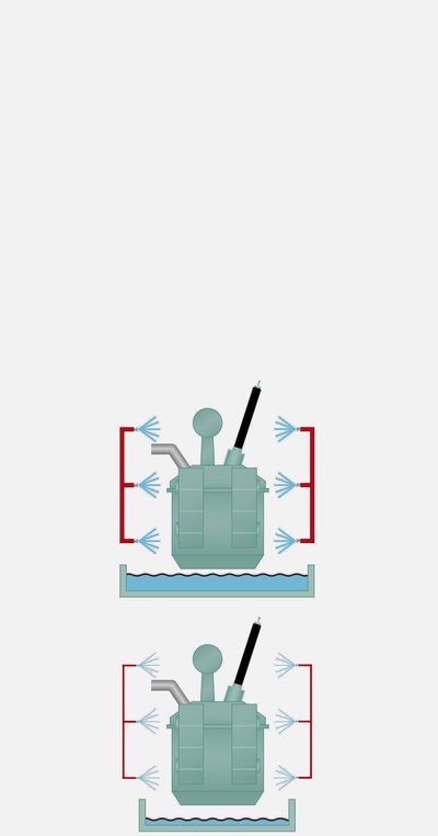 Type C TraFoProtect nozzles can be installed optionally in TraFoProtect systems in the level floor area under the transformer to specifically burning puddles in the floor pan. The fan-shaped spray pattern with a spray angle of 180° is typical for this type of nozzle.